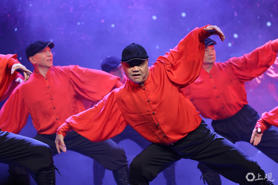 浦东新区陆家嘴金融城社区文化活动中心海尚男舞团的舞蹈《热烈》,以统一的红衫黑裤、大气的造型、英姿飒爽的舞姿,充分展现了男子豪迈的气魄和海派文化开放包容的底色。