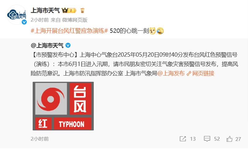 上海中心气象台2025年5月20日09时40分发布台风红色预警信号(演练)。 @上海市天气 截图