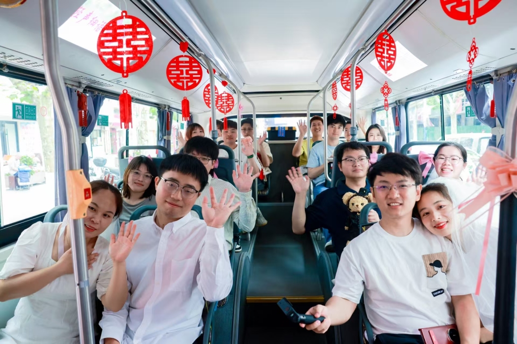 新人搭乘DZ1520“甜爱专列”巴士。 上海虹口 图