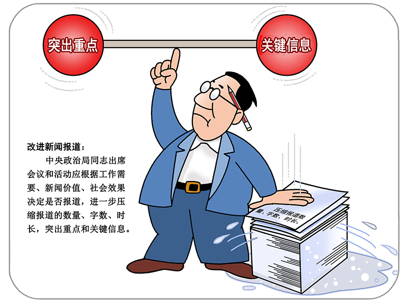 六、要改进新闻报道,中央政治局同志出席会议和活动应根据工作需要、新闻价值、社会效果决定是否报道,进一步压缩报道的数量、字数、时长。
