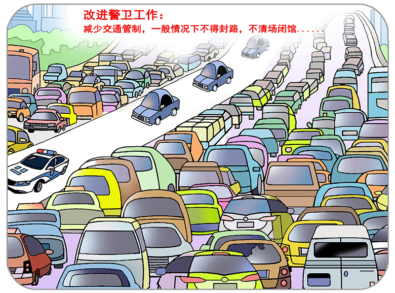 五、要改进警卫工作,坚持有利于联系群众的原则,减少交通管制,一般情况下不得封路、不清场闭馆。