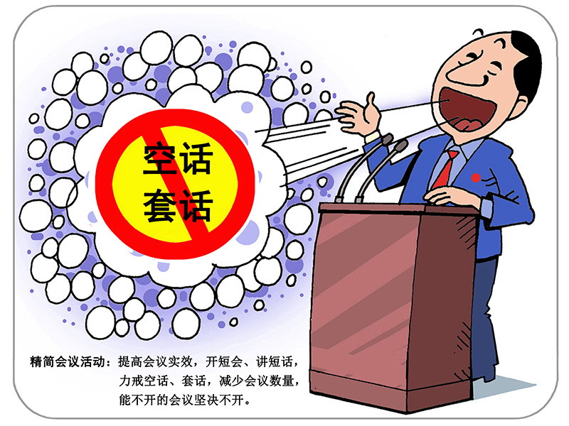 二、要精简会议活动,切实改进会风,严格控制以中央名义召开的各类全国性会议和举行的重大活动,不开泛泛部署工作和提要求的会,未经中央批准一律不出席各类剪彩、奠基活动和庆祝会、纪念会、表彰会、博览会、研讨会及各类论坛;提高会议实效,开短会、讲短话,力戒空话、套话。