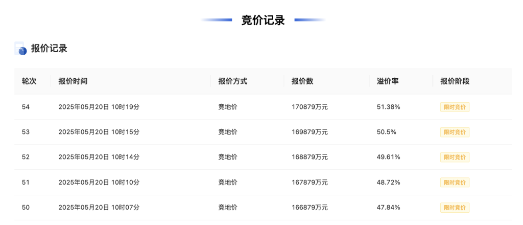 竞价记录显示,该地块经过54轮竞价后,由浙江保利置业有限公司以总价17.09亿元竞得,成交楼面价21965元/平方米,溢价率51.38%。