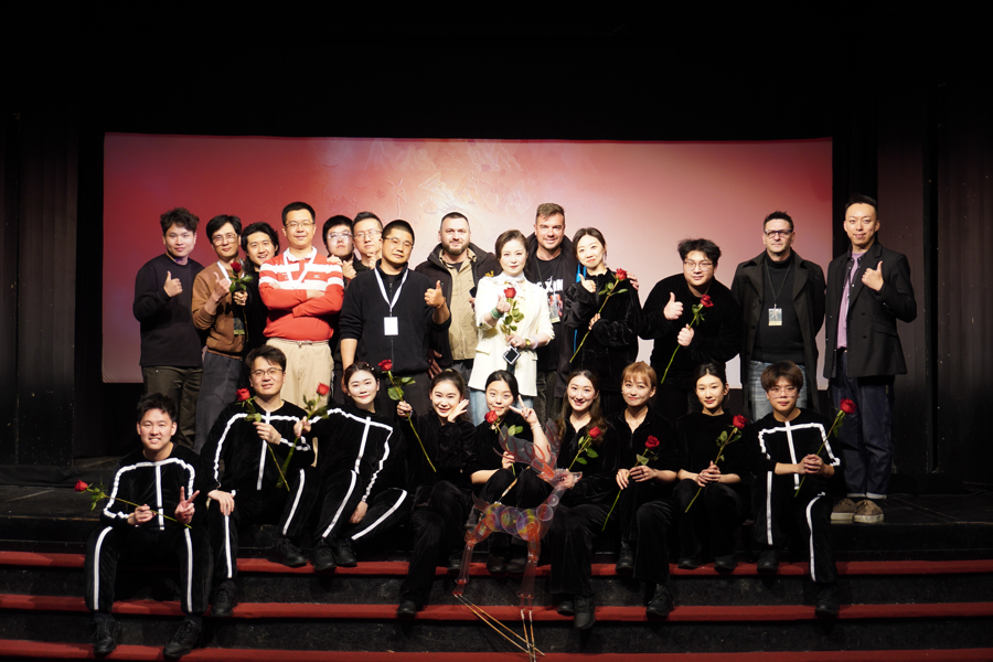 5月16日正式演出现场,《九色鹿》收获了意想不到的热烈反响。演出还未开始,剧场外就排起了蜿蜒长队。尽管存在语言隔阂,但跨越文化的皮影美学依然点燃了观众热情:当演员举着荧光皮影到台前时,大人们情不自禁惊呼着举起手机拍照:“Bravo!”小朋友们一边拍手一边朝舞台上张望。谢幕时刻将气氛推向高潮,全体演员手持鲜花致意,三次返场,观众掌声如潮。外国院团导演、评委与演员们握手祝贺,热情称赞这是一场“beautiful show”。塞尔维亚克拉古耶瓦茨剧院院长说:“你们总是如此擅长大型又时尚的偶戏表演,这是一场震撼的演出,谢谢你们把它带到塞尔维亚。”