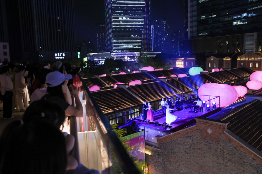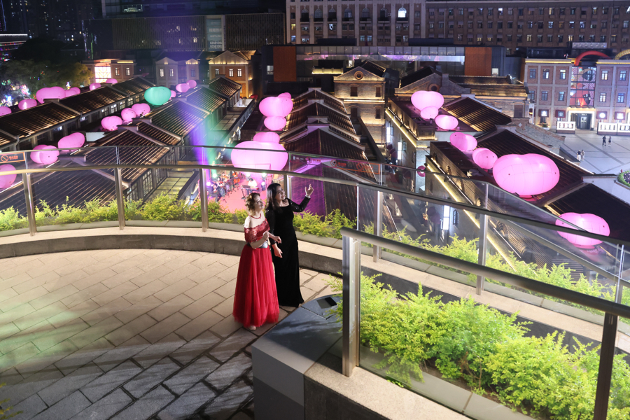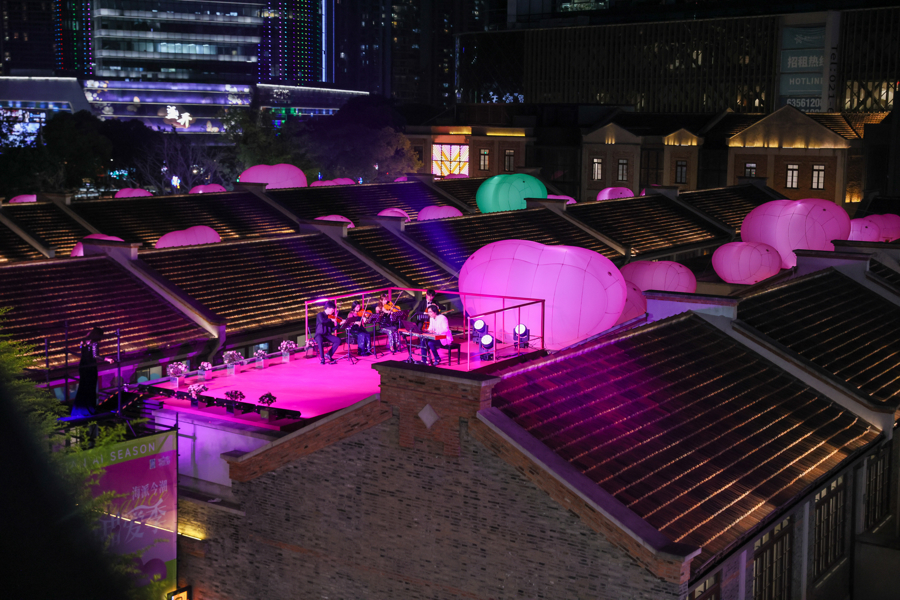 “5·20”前夕,滨港商业中心在2层至6层外部打造了退台式观景步道“甜爱廊”。沿步道而上,今潮8弄66幢百年建筑尽收眼底。只见36颗巨型爱心从弄堂顶部“冒出头”,甜蜜气息扑面而来。在9号楼顶部,新搭建的“屋顶舞台”鲜花环绕,10位青年艺术家组成首演阵容,在弦乐、舞蹈、歌曲的共同演绎下,《星光之城》《一步之遥》《姑娘的秋波》等十余首中外经典名曲被唱响。