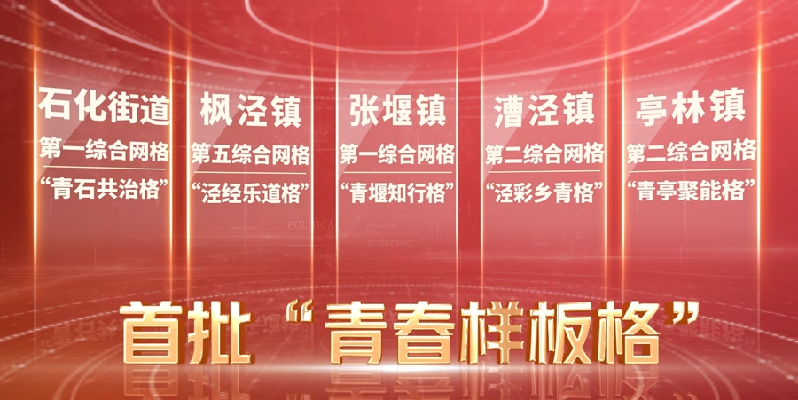 5个网格分别是以校地共建为主题的张堰镇第一综合网格·“青堰知行格”,以青创入乡为主题的漕泾镇第二综合网格·“泾彩乡青格”,以青春经济为主题的枫泾镇第五综合网格·“泾经乐道格”,以产业青年服务为主题的亭林镇第二综合网格·“青亭聚能格”,以多元共治为主题的石化街道第一综合网格·“青石共治格”。