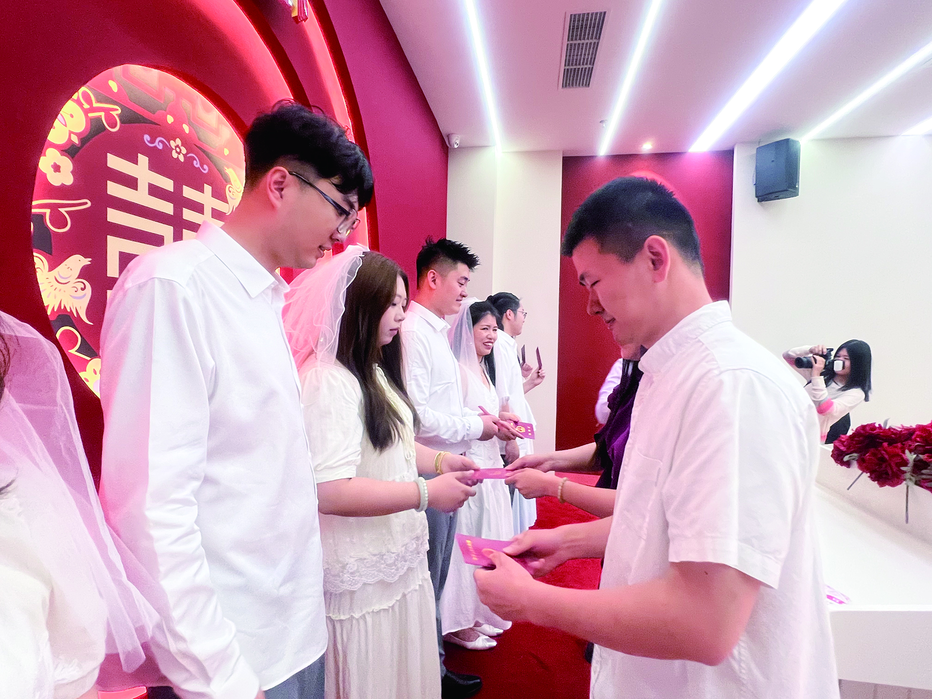 线上预约登记全满,线下窗口持续迎来新人。昨天是象征“我爱你”的“520”,也是婚姻登记“全国通办”新政实施后的首个高峰日,松江区婚姻登记管理所内人来人往,来自天南地北的新人在泰晤士小镇许下“一生一世一双人”的郑重承诺。