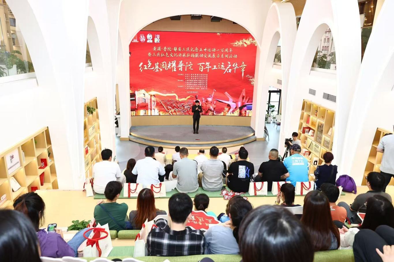 5月20日,黄浦-普陀-静安三区纪念五卅运动一百周年暨三区红色文化传承弘扬联动交流展示系列活动在普陀区半马苏河驿站・长风湾党群服务中心举行。