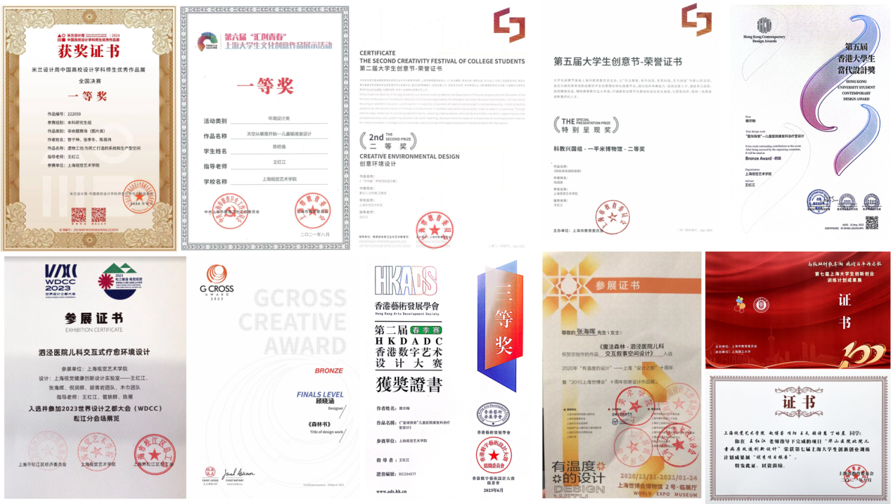l2023年第五届香港大学生当代设计奖铜奖3个,雒宗瀚:“星际探索”儿科医院康复科治疗室设计;蒋陈曦,与时空对话--疗愈咖啡厅;倪寒冰,B612 Planet新生儿科门诊等候区设计;