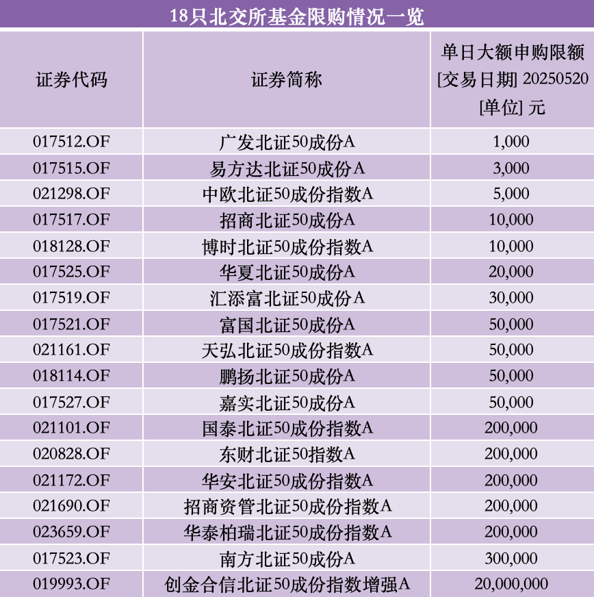 5月17日,易方达基金公告称,旗下易方达北证50成份指数自5月19日起,限购额度设定为3000元;5月13日起,鹏扬北证50成份指数将申购限额从3月下旬的50万元,进一步调整至5万元。