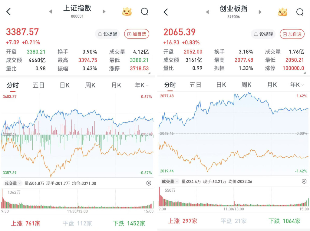 至收盘,上证综指涨0.21%,报3387.57点;科创50指数跌0.22%,报995.49点;深证成指涨0.44%,报10294.22点;创业板指涨0.83%,报2065.39点。