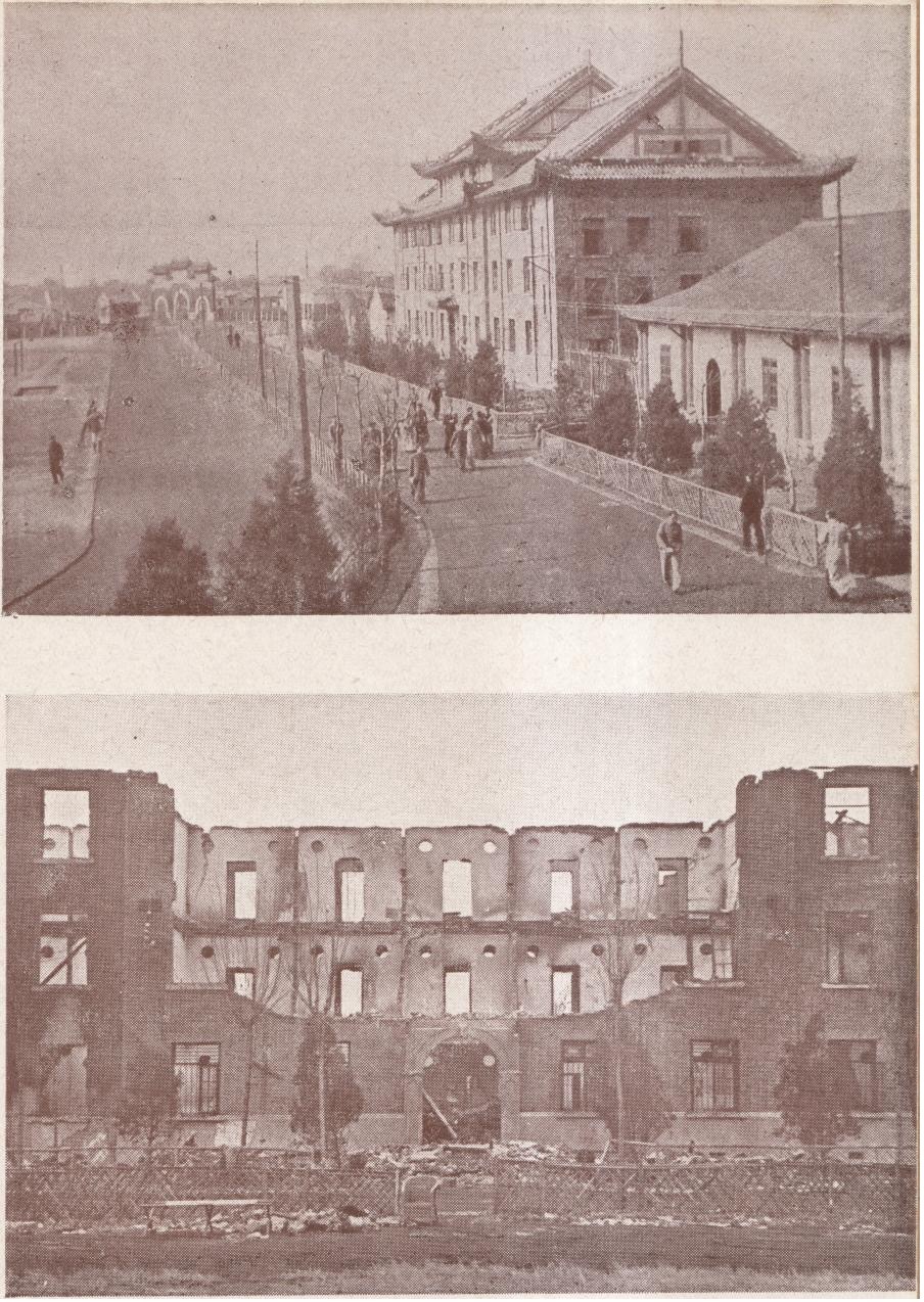 1937年11月,光华大学男生宿舍被炸毁前后对比照片。