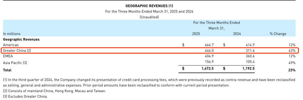 分地区来看,一季度亚玛芬大中华区营收达4.46亿美元,同比增长43%;亚太地区达1.57亿美元,同比增长49%;美洲地区达4.65亿美元,欧洲、中东和非洲地区(EMEA)达4.05亿美元,均实现12%的增长。