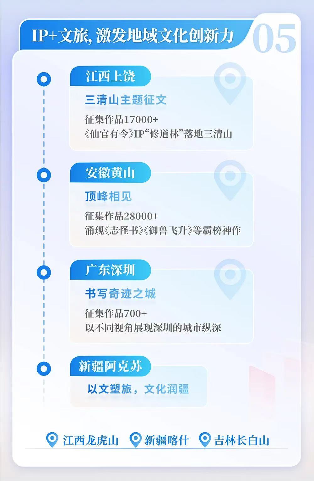 2024年,江西上饶、安徽黄山、广东深圳等地相继与阅文集团展开深度合作,探索网络文学IP与本地旅游场景的融合路径。数据显示,“三清山”“大黄山”主题征文累计征稿45000余部,涌现出《仙官有令》(裴不了)、《志怪书》(金色茉莉花)、《御兽飞升》(轻泉流响)等佳作,为网络文学参与文旅IP共创探索了全新路径。