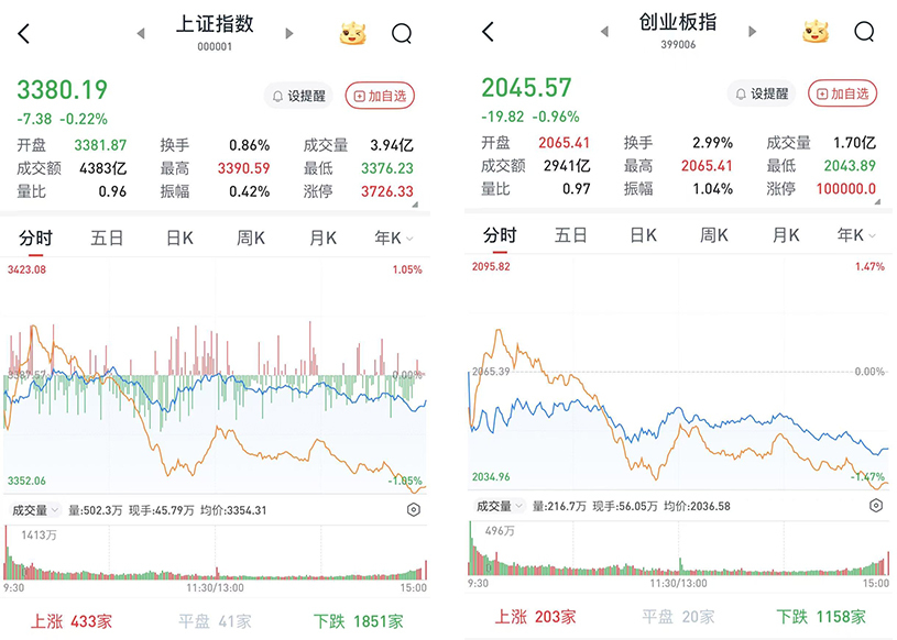 至收盘,上证综指跌0.22%,报3380.19点;科创50指数跌0.48%,报990.71点;深证成指跌0.72%,报10219.62点;创业板指跌0.96%,报2045.57点。