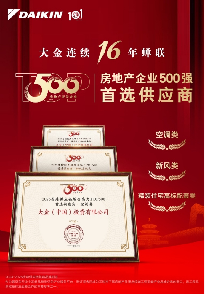 在此背景下,大金凭借在生产力、产品力、服务力、交付力、创新力层面的持续革新,多年来已成为深受全国头部房地产开发商信任与青睐的供应商。至2025年,大金已连续16年获选“房企TOP500首选供应商”,不仅印证了大金出色的产品实力,更体现了大金在房建供应链各个层面中高标准的严格要求。