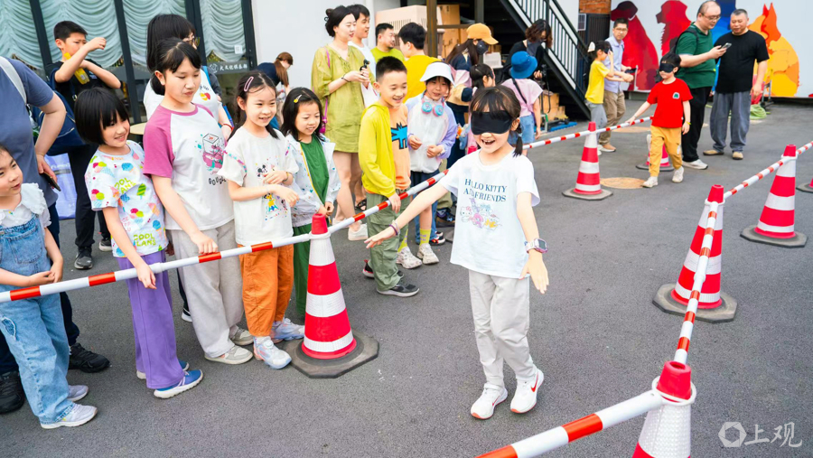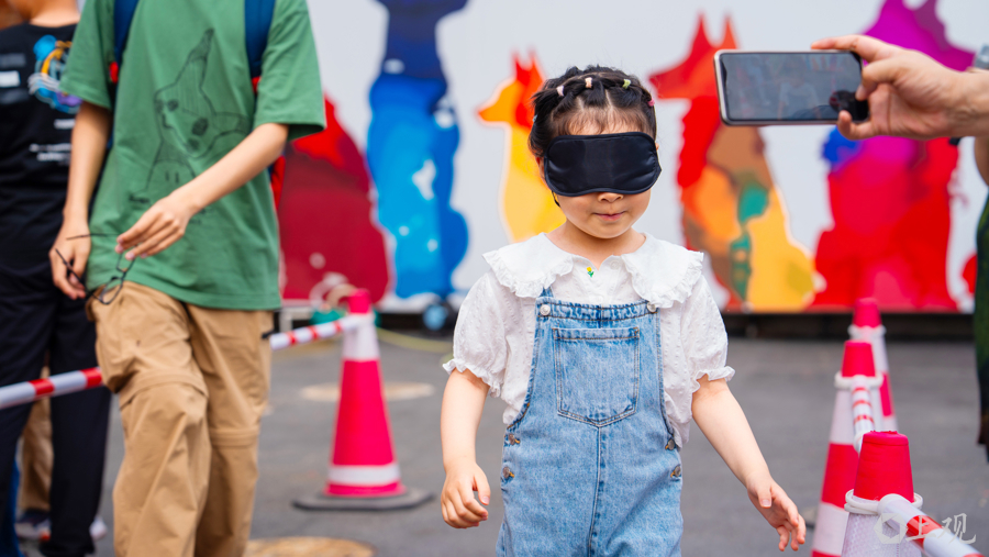 互动体验环节,大朋友和小朋友蒙上双眼,在设置好的模拟障碍路线中摸索前行,亲身体验视障人士出行的艰难。