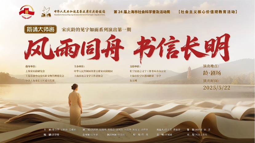 东方网5月23日消息,为纪念中国人民抗日战争暨世界反法西斯战争胜利80周年,宋庆龄陵园自创朗诵大师剧“宋庆龄的见字如面”系列第一期《风雨同舟 书信长明》于5月22日在“龄·剧场”成功首演。演出通过艺术化演绎宋庆龄的往来书信,引领观众跨越时空,走进伟人波澜壮阔的革命生涯,见证伟人风雨同舟的赤诚初心。