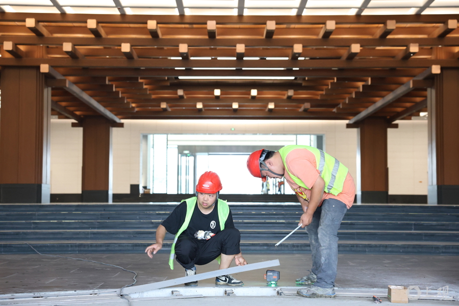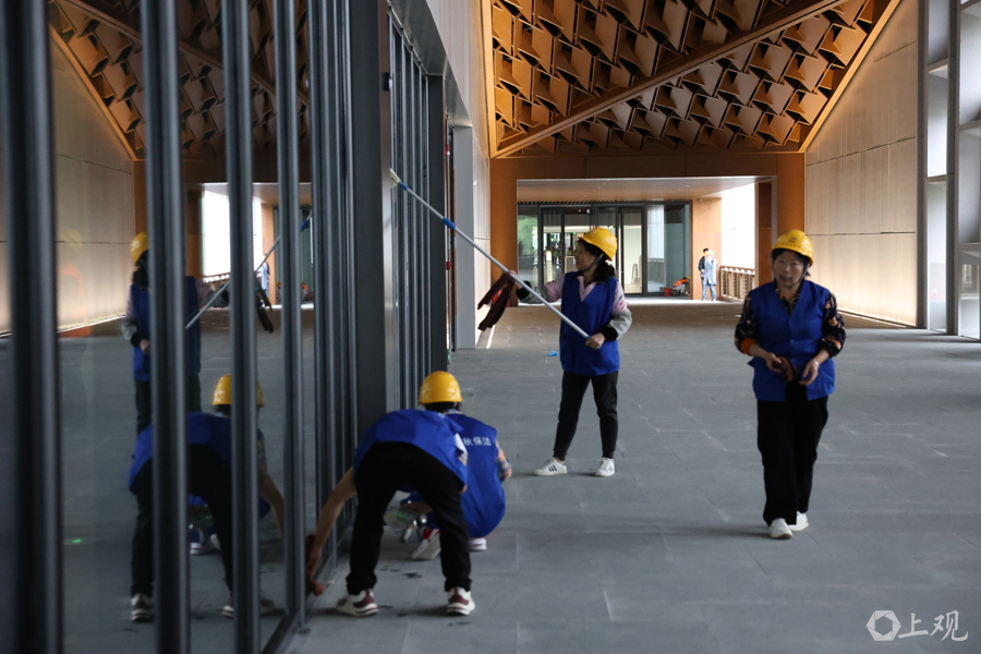 工人们加紧设备调试和保洁工作。