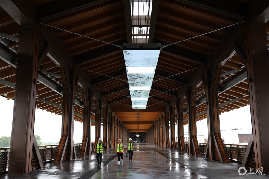 从空中俯瞰,“方厅水院”呈现出规整而又极具韵味的四合院形制,连接各建筑的步行桥,不仅是交通枢纽,更是巧妙构思勾勒的线条,四角的建筑分别承载着沪苏浙皖的主题展示空间。