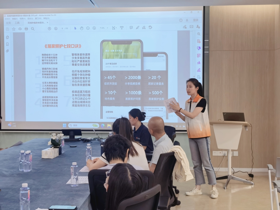 爱途长情项目团队受邀参加本次活动,带来了分享报告《肿瘤患者居家照护如何开展》,这也是该团队从“观星地球”品牌全面升级后的首次院内线下服务。观星地球自2023年公众号及小程序上线以来,已陪伴超过2200个家庭,爱途长情团队将持续为患者家庭服务。此次团队针对癌症中晚期患者居家照护的要点进行详细讲解,涵盖居家照护注意事项、症状及并发症的观察、预防和应对方法等。团队编写的《癌晚居家照护七字口诀》及《七段口诀》以简洁易懂的方式,将复杂的照护知识进行总结归纳,让患者和家属能够快速理解并记住,以便在院外生活中更好地应用,使更多患者和家庭从中获益。