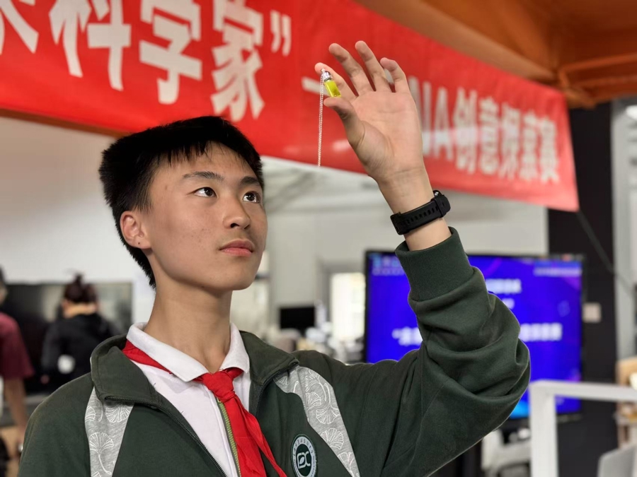 用胶头滴管吸出DNA封装于玻璃瓶中,再滴加自己喜爱的墨色,一款独一无二的“香蕉DNA项链”便制作完成了。这是今天开启的2025年凉城新村街道科技节暨社区青少年科技创新邀请赛中的一项赛事,也是街道推动园区、社区、校区协同联动的又一场实践。