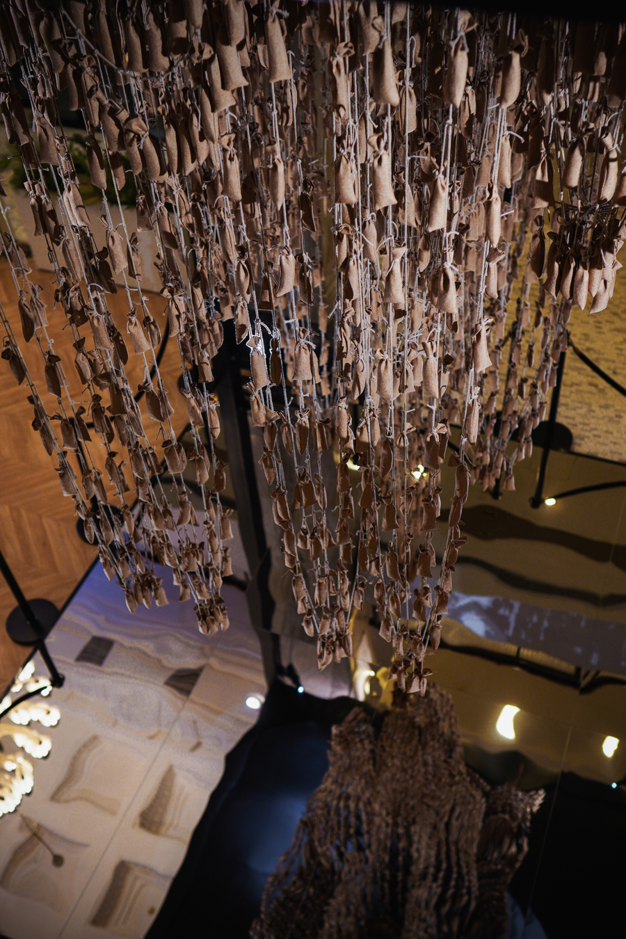 高近五米的大型装置,由自然垂落的8000只小布袋构成,从外滩18号久事艺术空间挑高的天花板上垂下,好不壮观。借由装置下方的玻璃镜面,装置倒映的上拱弧度,恰勾勒出圣家堂的轮廓。这令不少观众惊呼“太神奇了!”