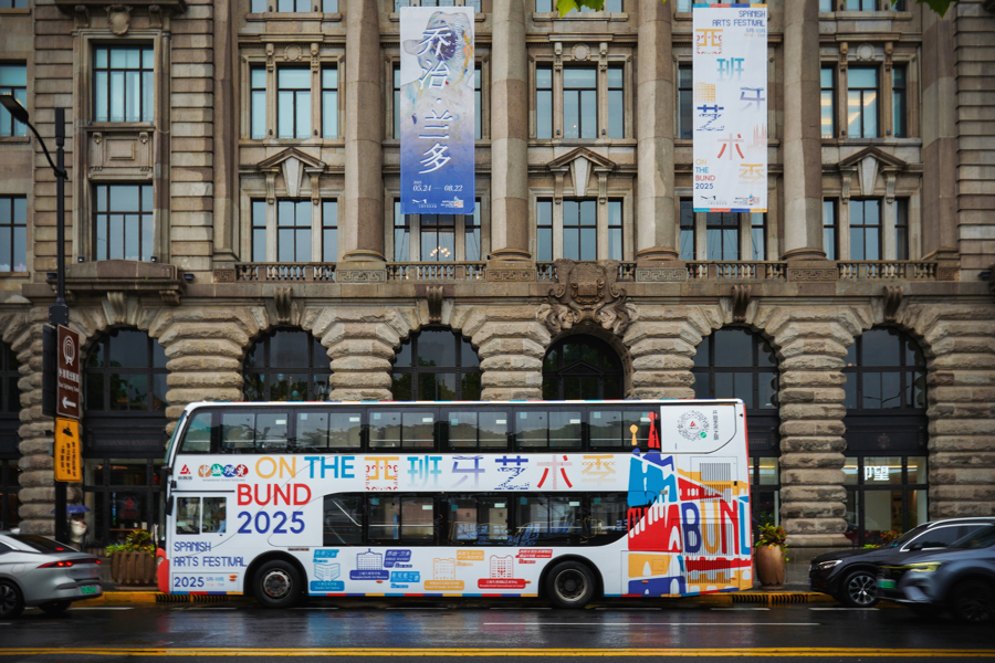 随着艺术季启幕,久事美术馆群落旗下两处场馆所在地外滩18号及外滩27号限时“焕新”,在建筑外立面的巨幅艺术季海报之下,成为别具一格的“外滩艺术立面”。定制版公交巴士及强生出租车化身“移动艺术展厅”传递西班牙艺术魅力,让艺术渗透城市的角角落落。
