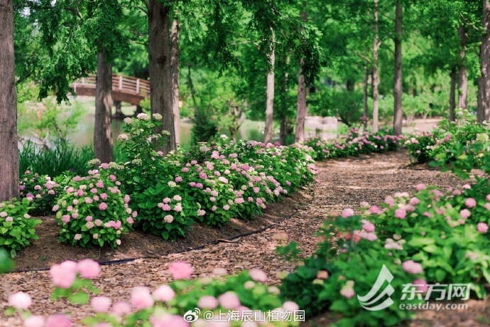 东方网记者柏可林5月24日报道:初夏的上海景色宜人,本周末阳光不热不燥,下周仍将延续“神仙”天气,20℃到28℃的气温适宜出游。端午假期将至,辰山植物园和共青森林公园绣球花海盛放,一场场花事盛宴为游园的市民游客营造出充满艺术和活力的沉浸式游园体验。