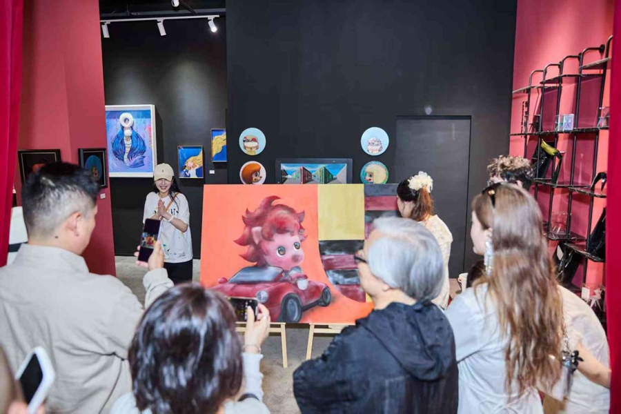 开幕仪式现场,象征艺术新生的AT红球装置亮相,身着文化衫的舞者从画廊中翩然走出,为现场观众带来别样体验。保时捷车主与艺术家CY骋妍共同进行现场创作,展现出艺术与大众互动的趣味性。