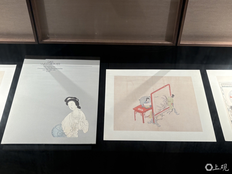 展览现场,《西厢记图册》中西两种印刷复刻版本的对话展示颇具视觉冲击力。原版《西厢记图册》现收藏于德国科隆东方艺术博物馆,是明崇祯十三年(1640年)由吴兴闵寓五氏主持刊印的明版孤本套色画,因此又称为“寓五本”。1977年,科隆东方艺术博物馆曾将这套明刻套色版画影印发行。朵云轩自1900年创立传承木版水印技术至今,将木版水印技艺提升为一门综合绘画、雕刻与印刷的再创造艺术。1980年代末,朵云轩以科隆版《西厢记图册》为底本,以木版水印传统技艺重新付梓,经过三年打磨,于1990年印成《明刻套色<西厢记>图册》,限量编号发行300册,凭借精湛的技艺重现了原版的神采。两个版本的首次相逢展示,不仅展示了中国文化的海外传播,也见证了中西文化的交流互通。