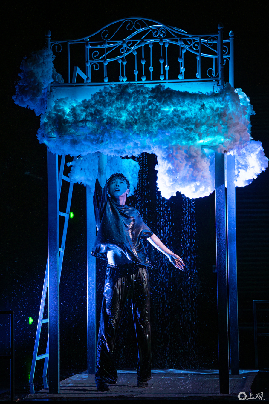 首演前,剧组每天清晨奔赴青浦的舞美工厂,在漏风的厂房水泥地上排练至深夜。凛冬寒风透过破损的窗户呼啸而入,学生们裹着军大衣、贴着暖宝宝起舞;8万元的极限预算下,他们用网购的服装道具、货车与手工搭建的雨幕装置共同撑起诗意舞台,“我们像是在完成一场行为艺术”,董杰回忆道,“但正是这种纯粹,让作品保有赤子之心。”