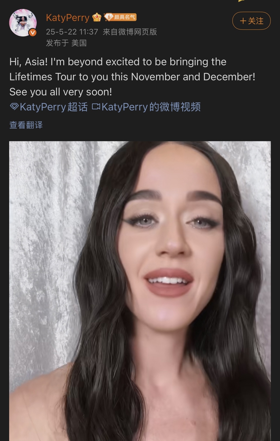 紧随其后,另一位欧美热门女歌手凯蒂·佩里于5月20日官宣亚洲巡演,上海站定档11月24日至25日。这是她继2015年“棱镜”巡演后时隔十年重返申城。值得一提的是,“水果姐”刚以“全女团”成员身份完成了蓝色起源太空之旅,成为全世界首位登上太空的流行歌手。她的上海站演唱会将在梅奔中心举行,演出以“生生不息”为主题,结合科技与艺术元素,展现其标志性的舞台美学。“亚洲的朋友们,我非常激动地宣布,凯蒂·佩里‘生生不息’世界巡演将于今年11月至12月来到你们身边!我们将登陆杭州、上海和东京,带来一场场流行音乐的狂欢盛宴。”在给歌迷发来的视频问候中,“水果姐”兴奋地邀请大家准备好迎接充满能量、惊喜不断的夜晚。“歌单里全是新旧经典,绝对让你们大呼过瘾。我已经等不及要和你们一起唱歌跳舞,创造专属回忆啦,希望尽快见到大家!”