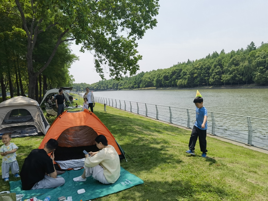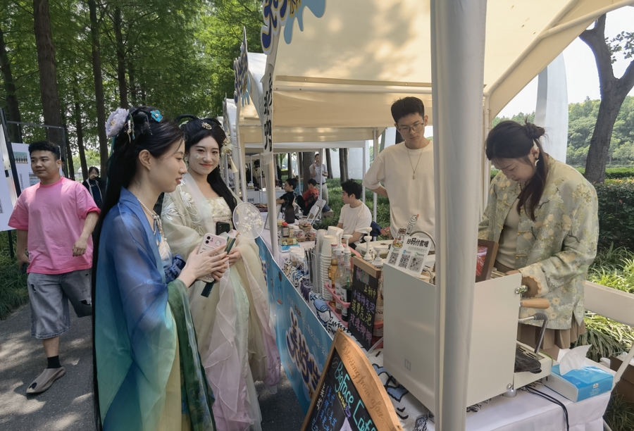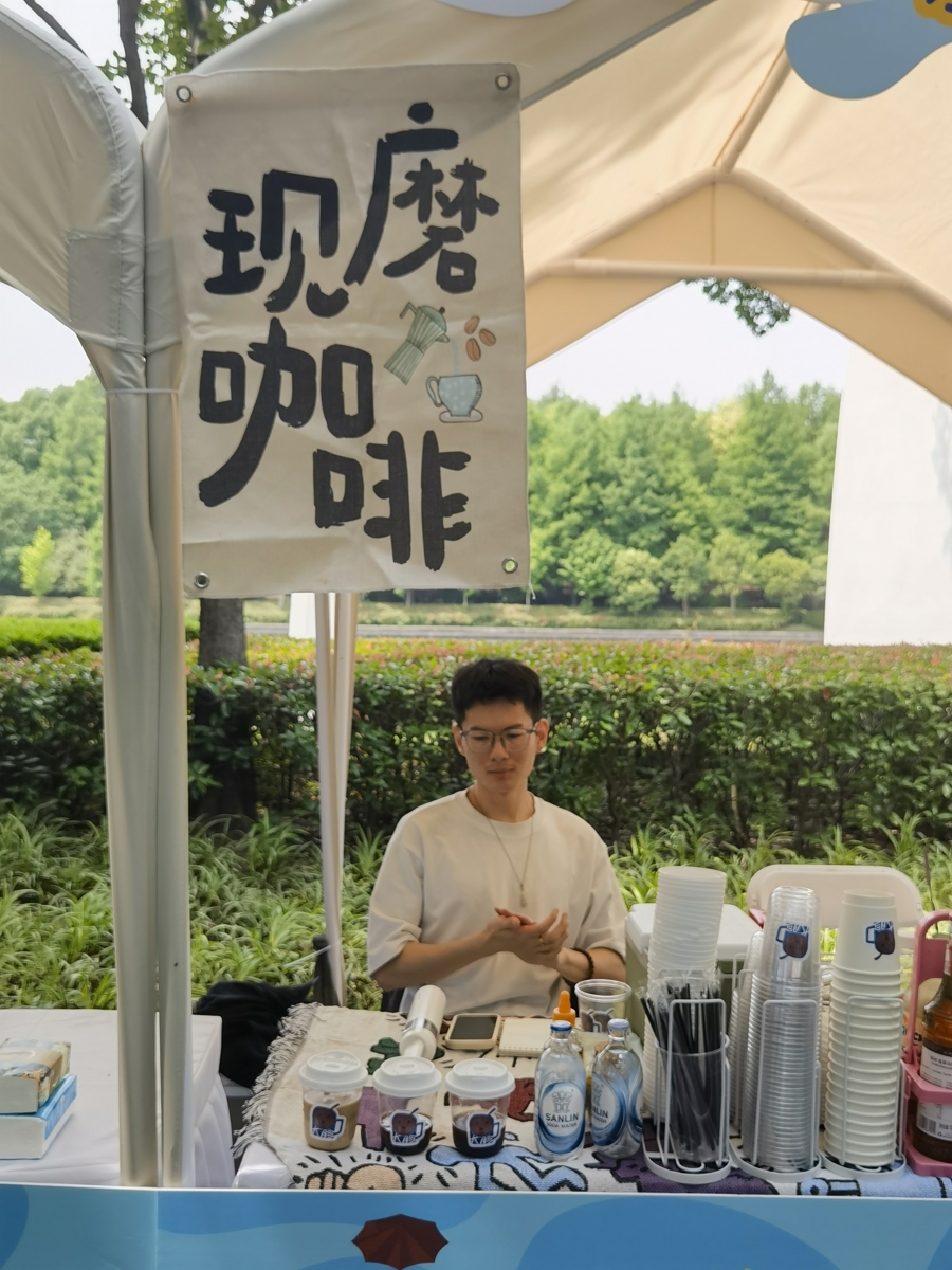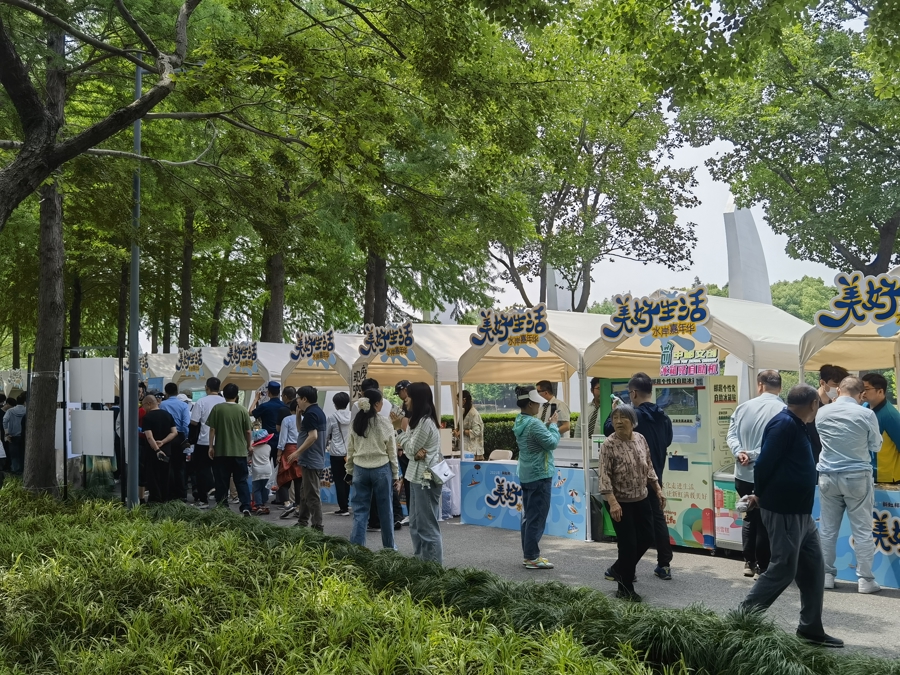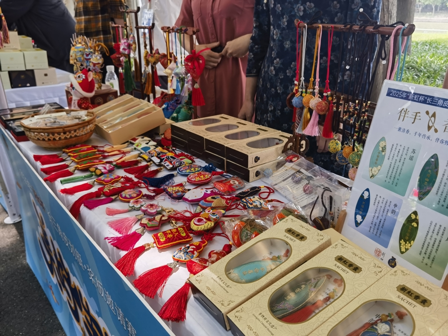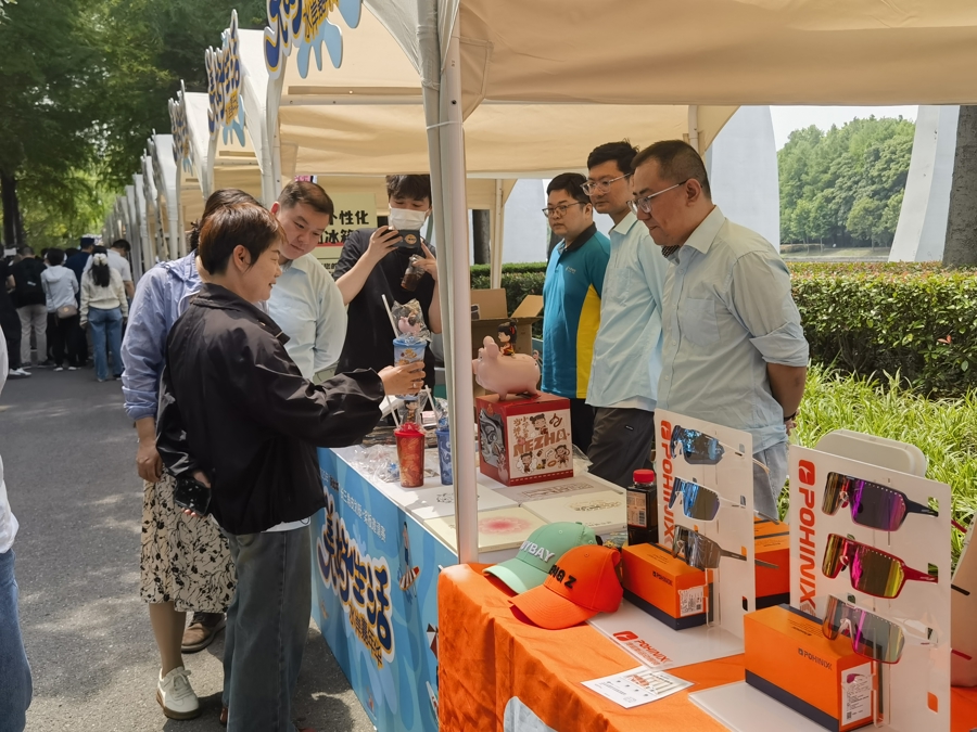 本届赛事岸上新增的“美好生活·水岸嘉年华”,人气很旺:沿着华翔绿地公园主干道,20多个特色摊位一字排开,运动眼镜、非遗香囊、文创雪糕、有声明信片、民国“小红书”文创周边、水上运动主题邮票展等,每个摊位前都吸引了不少游客驻足体验,一些古风NPC也身着汉服穿行其间,现场好看又有趣。