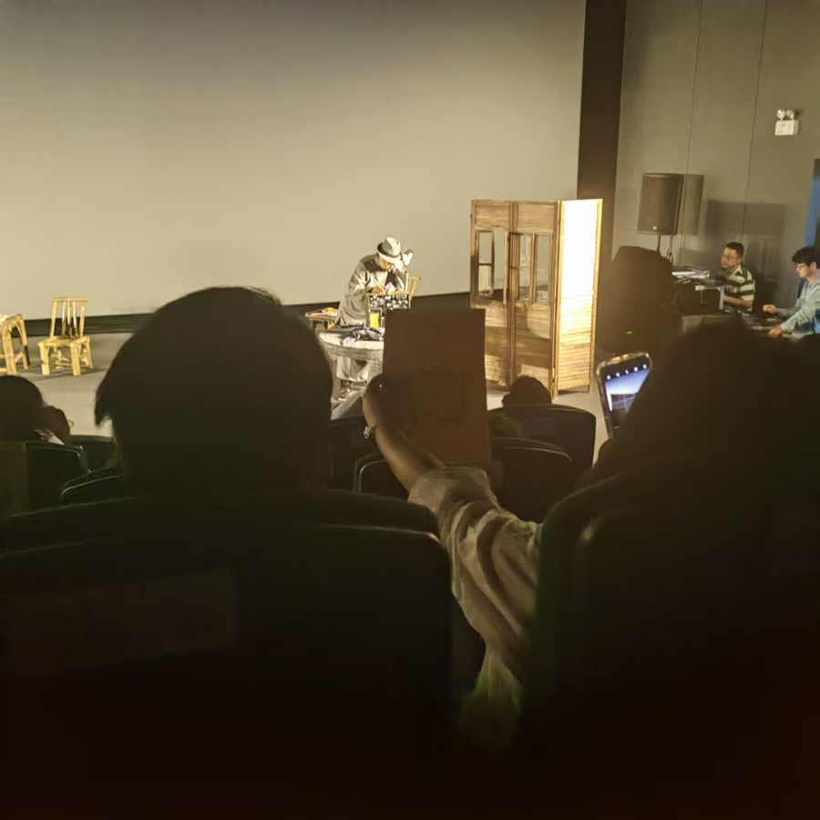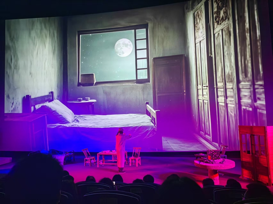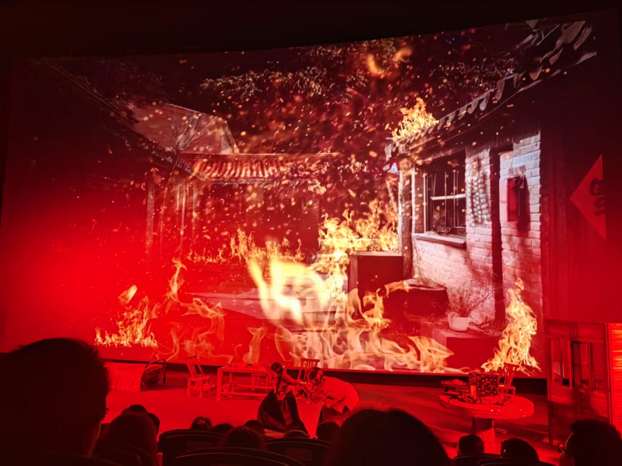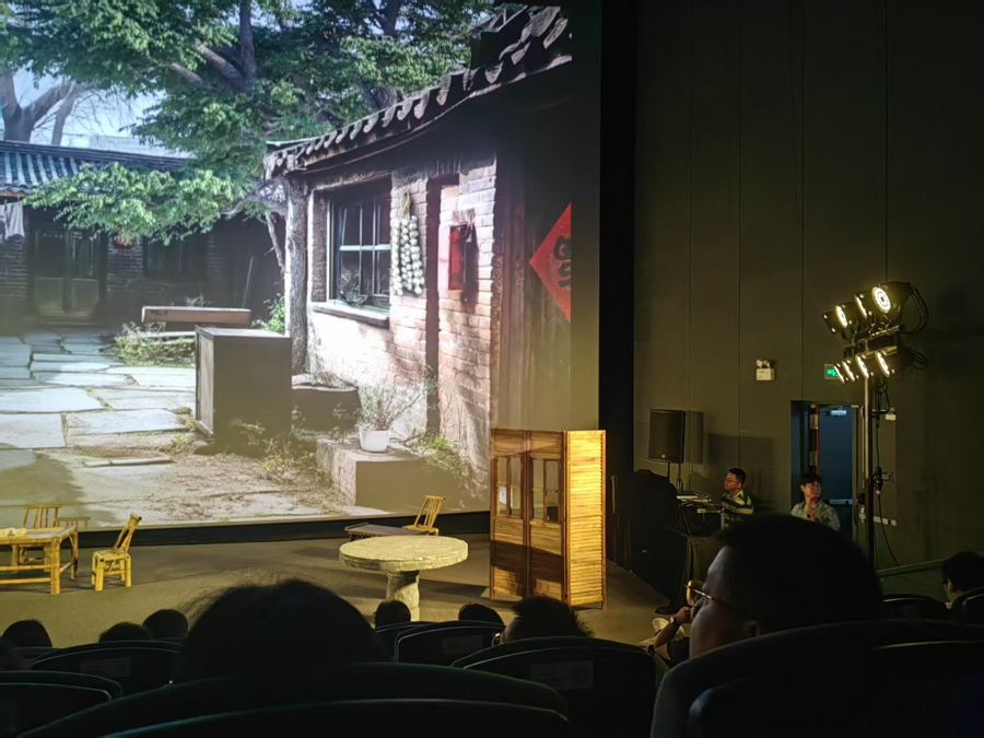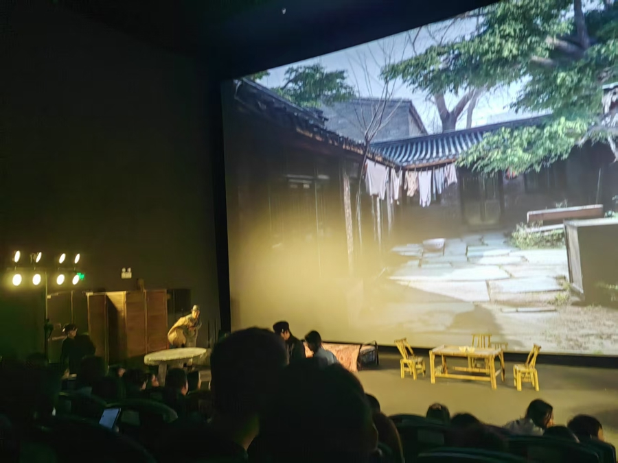 走进《觉醒年代之新青年》8号影厅,记者发现,该剧并未对影厅进行结构改造,仅在影厅前侧左右两边各加了两组灯光。调控台和上下场门用屏风遮挡。由于没有剧场舞台的侧台、吊杆等,因此道具相当简单,几乎全摆在观众席与银幕之间的空地上,包括一张床、一张长桌、几把椅子。“舞美布景”靠影院大银幕播放布景,犹如PPT。缺少了足够的舞台灯光,从观众席五六排起,演员的脸就变成了模糊的“灰色”。