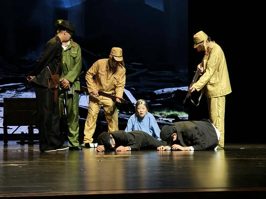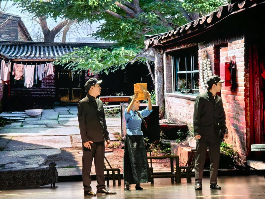 演出过程中,不时有演员走到前排“VIP区”互动,给观众送上剧中纪奶奶刚晒的“地瓜干”,或是分发印好的“新青年”传单。当反派押着女主角“游街示众”,浑身是“血”的女演员赤着脚被“五花大绑”推入观众席,一边大声呼喊救国口号,一边沿着台阶一路而上,穿过后排观众,再从另外一侧被推搡着跌跌撞撞而下,甚至一个趔趄,撞到观众举着拍演员的手机。