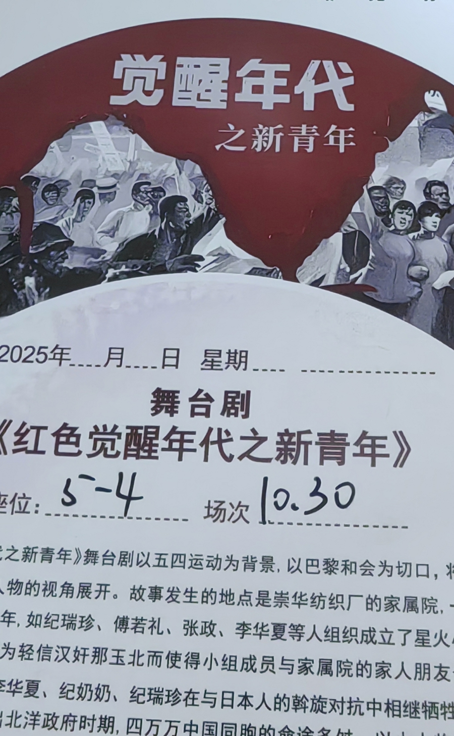 与一般电影票、演出票可以凭取票码在售票机取实体票不同,《觉醒年代之新青年》不能自助凭码取票。观众凭票务网站发出的二维码验票后,一位身穿长衫的工作人员,在检票口现场提供纸质票,票上的座位号均为手写。