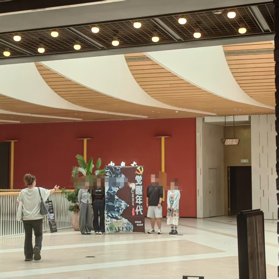 5月24日上午,记者来到该影院,发现影院门口有不少人组队围着剧目海报打卡,明显为集体团建活动。海报上打着醒目的“觉醒年代”,而剧目后半段“之新青年”则显得相当不起眼。10时30分左右的观众基本都是来看该剧的,其中大多为年轻人,也有个别中老年人、亲子家庭。