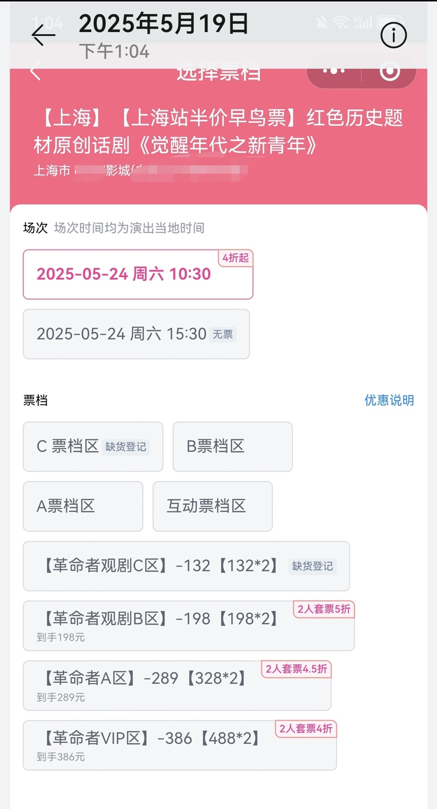 5月24日至25日,《觉醒年代之新青年》在上海某IMAX影院上演,最早一场排在上午十点半,分为132元到488元双人票价四档票价。记者在5月19日查询票务网站发现,24日下午场售罄, 24日上午场最低档132元双人套票售罄。