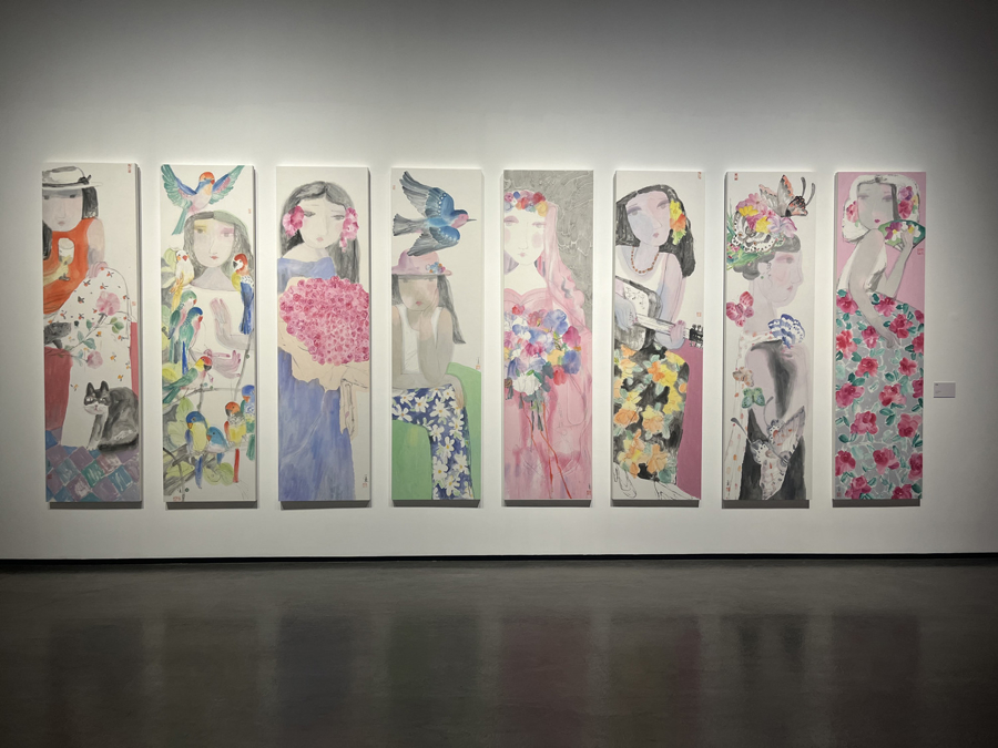这是马小娟时隔八年再办个展,为此她创作了不少新作。其中八条屏组画《翩翩》《嫣然》《凝望》以及十条屏组画《花语》尤为亮眼,呈现出一种难得的自由与畅快,笔墨格外松弛,色彩也格外明丽。她坦言想放开手脚,大胆地画一些有别于以往的东西。
