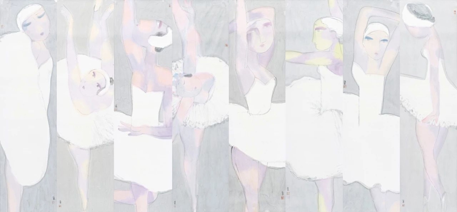 其中,《翩翩》是其创作于2023年的主题画《朱鹮之舞》的延申,每一条屏都聚焦不一样的肢体舒展,以灰色背景衬托出舞裙的洁白,不在乎动作的准确性,寻找的是一种感觉。