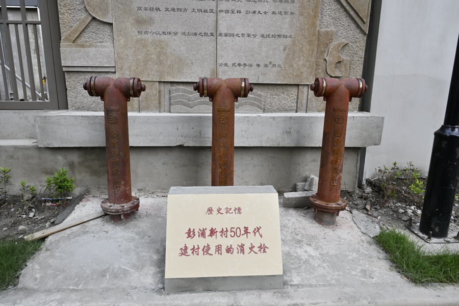 浮雕墙旁,3个消火栓同样引人注目。记者了解到,这是1958年彭浦新村建村时就使用的消火栓。1958年,上海全市水厂联网,改造管道形成循环网络管道,当时全市共建有市政消火栓4918只,这3只消火栓一直保存至今。