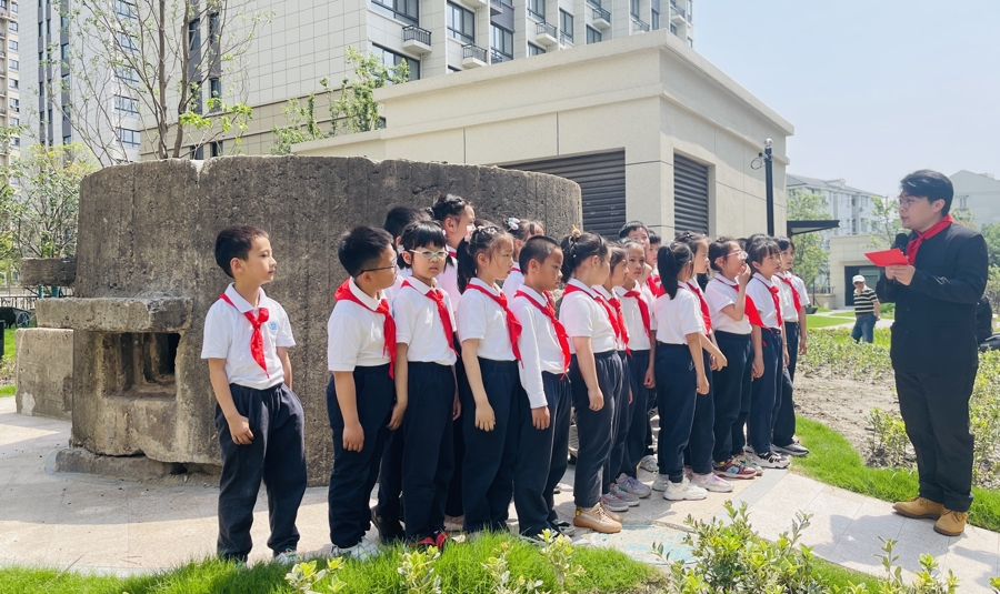 活动现场,静安区第四中心小学还举行了少先队入队仪式,90名二年级学生在碉堡前成为了光荣的少先队员。“我要好好学习、天天向上,为祖国建设做出更大贡献。”静安区第四中心小学二(1)班学生董礼玥说。