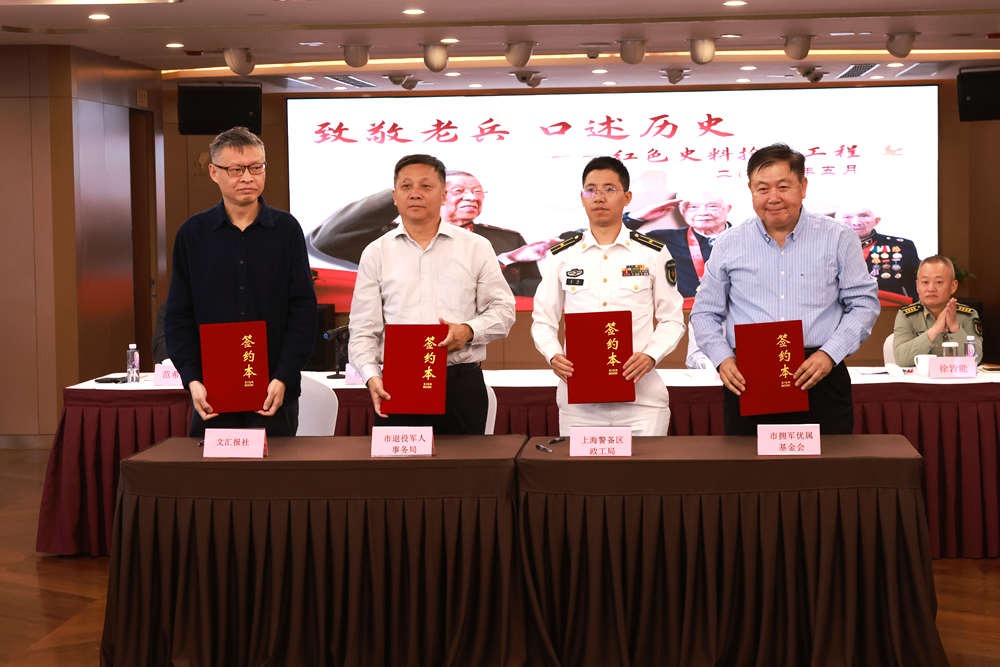 会议现场,上海市拥军优属基金会浦东区会领导、上师大退役军人学院学生代表热情发言,汇报了开展工作情况,表达了坚定的支持与积极参与的决心。会议披露了新充实调整的工作方案和重新编制的项目书,通过视频专题片回顾了一年工作,在交流体会中统一思想。随后,与会的上海市退役军人事务局、上海警备区政治工作局、文汇报社和上海市拥军优属基金会代表共同签署全面合作意向书,四家单位领导分别讲话表态积极支持。这一重要时刻,标志着这项向建军百年献礼的口述历史工程迈入协同推进的崭新阶段。