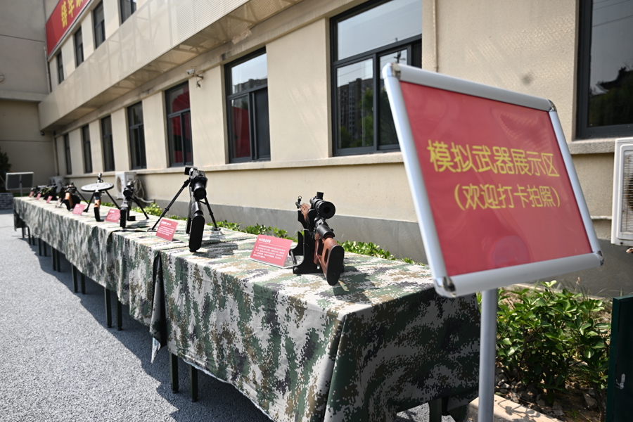 今年的活动还设置了国防主题市集,观众不仅可以近距离观摩军事模型,还可以扫码答题兑换国防文创,现场体验模拟射击、无人机足球等。现场还展示了学生亲手制作的航海、航天国防主题模型,脑电小车等。