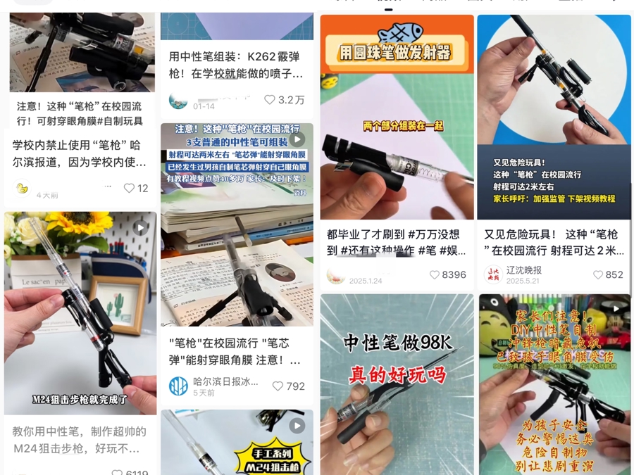 社交平台上,一边是官方媒体呼吁关注“笔枪”风险,一边是源源不断的“笔枪”组装视频不断上线。