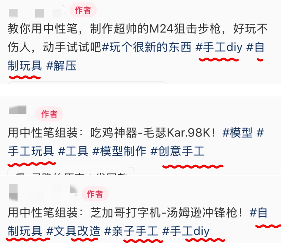 记者调查发现,孩子们玩耍的“笔枪”原材料都是普通的中性笔或圆珠笔,将笔的弹簧、笔芯、笔杆、软胶套等部件拆下后,重新组装而成。多家社交平台上都有详细的组装视频,甚至细分到不同枪型,如M24、AK47、汤姆逊冲锋枪等。正如老师所言,这类视频大多冠以“创意手工”“自制玩具”“手工DIY”等标签。
