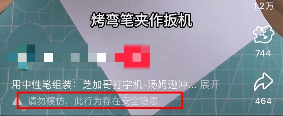 而在提示“笔枪”风险方面,只有部分视频下方有“请勿模仿,此行为存在安全隐患”的浅色标签。若不仔细辨别,很容易忽略。