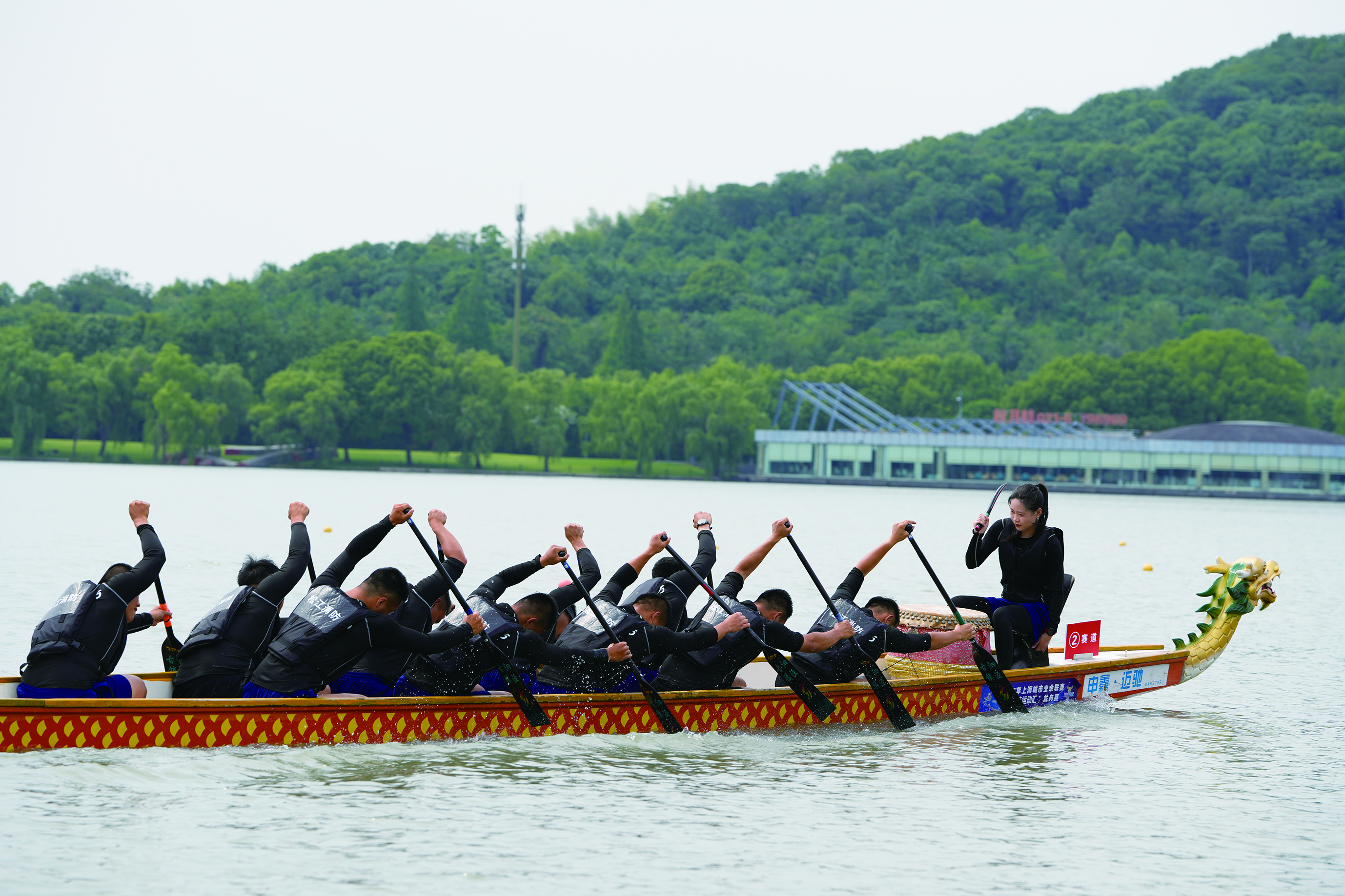 棹影斡波飞万剑,鼓声劈浪鸣千雷。湖面上,随着鸣笛声响,一支支龙舟如离弦之箭,劈波斩浪、奋勇向前。龙舟上,“蓝朋友”齐心协力、奋力挥楫,在鼓手铿锵有力的鼓声里一路加速冲刺,驶向终点。