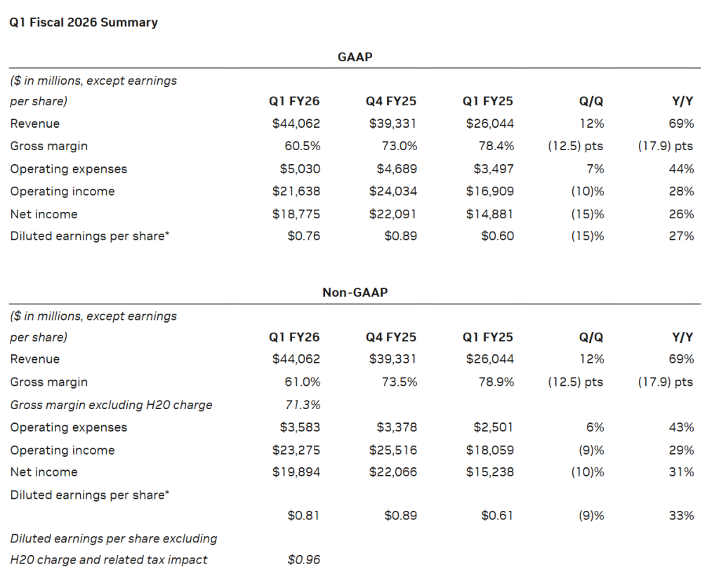 当地时间5月28日美股盘后,英伟达(Nasdaq:NVDA)发布了截至4月27日的2026财年第一财季财报,期内实现营收440.62亿美元,同比上涨69%,高于市场预期的432.8亿美元;美国通用会计准则(GAAP)下净利润187.75亿美元,同比上涨26%;Non-GAAP下每股摊薄收益为0.81美元,同比上涨33%;如果不计算H20芯片出口管制所造成的费用以及相关税收影响,每股摊薄收益将达到0.96美元,超出市场预期的0.86美元。